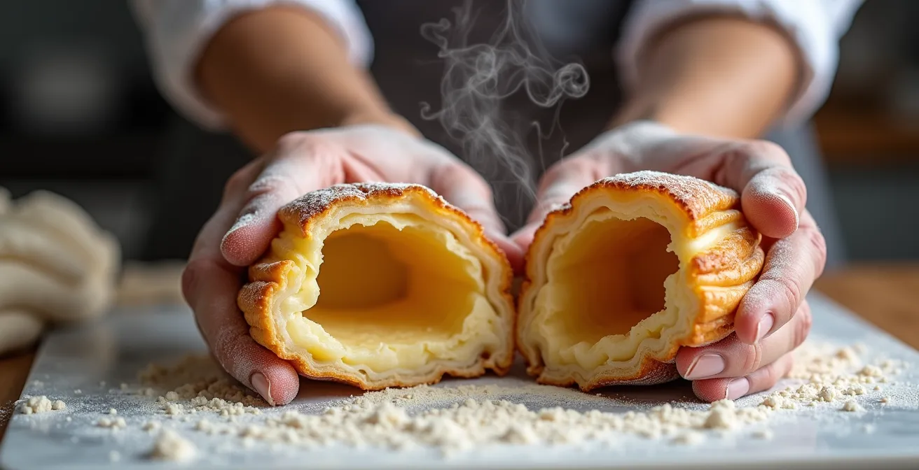 There is no greater disappointment in baking than pulling a tray of beautifully golden, perfectly puffed choux from the oven, only to watch them deflate into sad, soggy disks. Or worse, you fill them, take a bite, and discover a dreaded gummy, raw interior. This common frustration plagues bakers who rely on the most misleading advice of all: “bake until golden brown.” Color is a liar. It tells you nothing about the internal structure, which is the true heart of successful choux pastry.